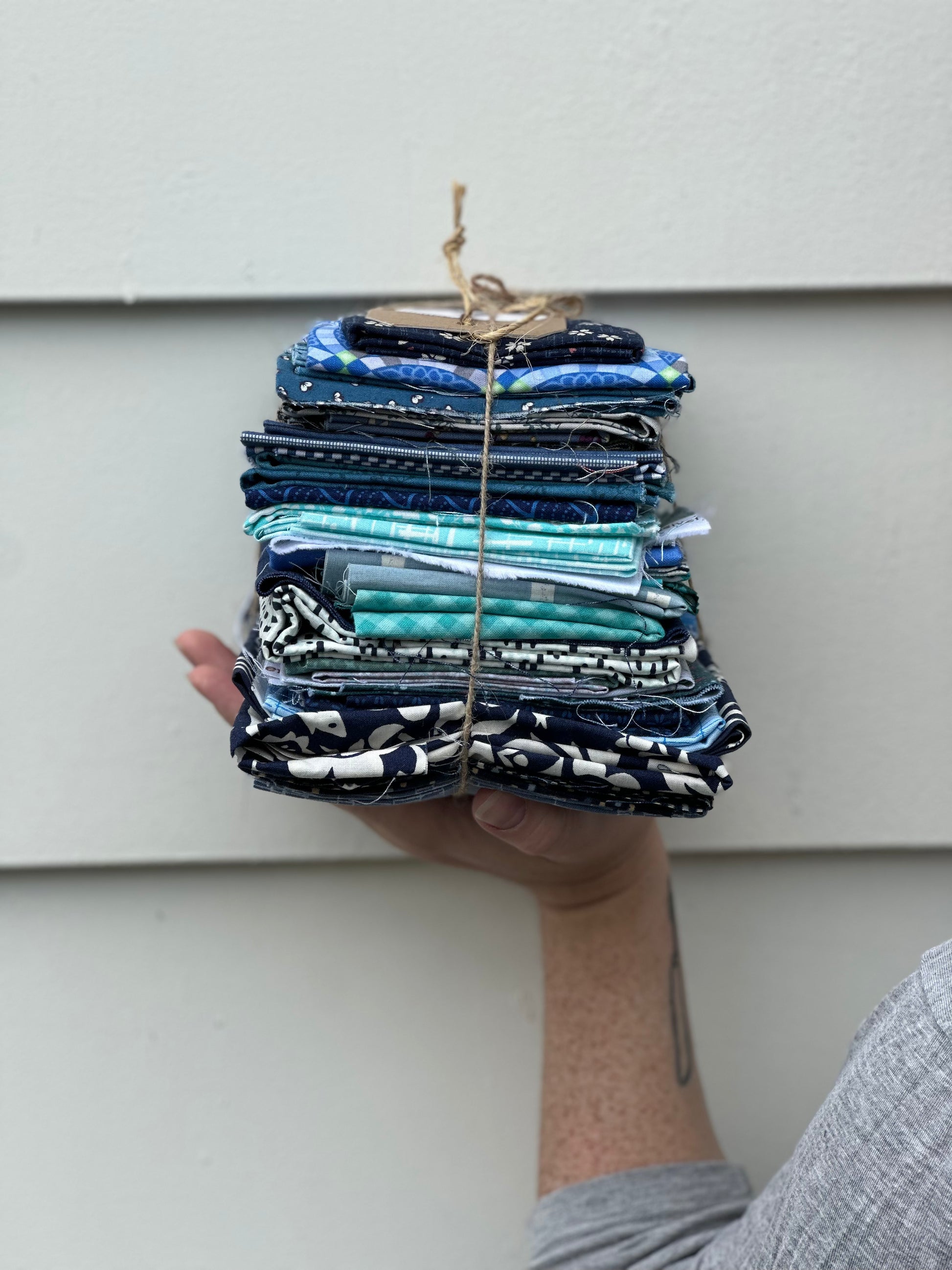 A cozy little bundle of fat quarters and smaller in all different tones and tints of BLUE. Scrap-sized treasures - perfect for sparking your next thrifty, one-of-a-kind creation.ย