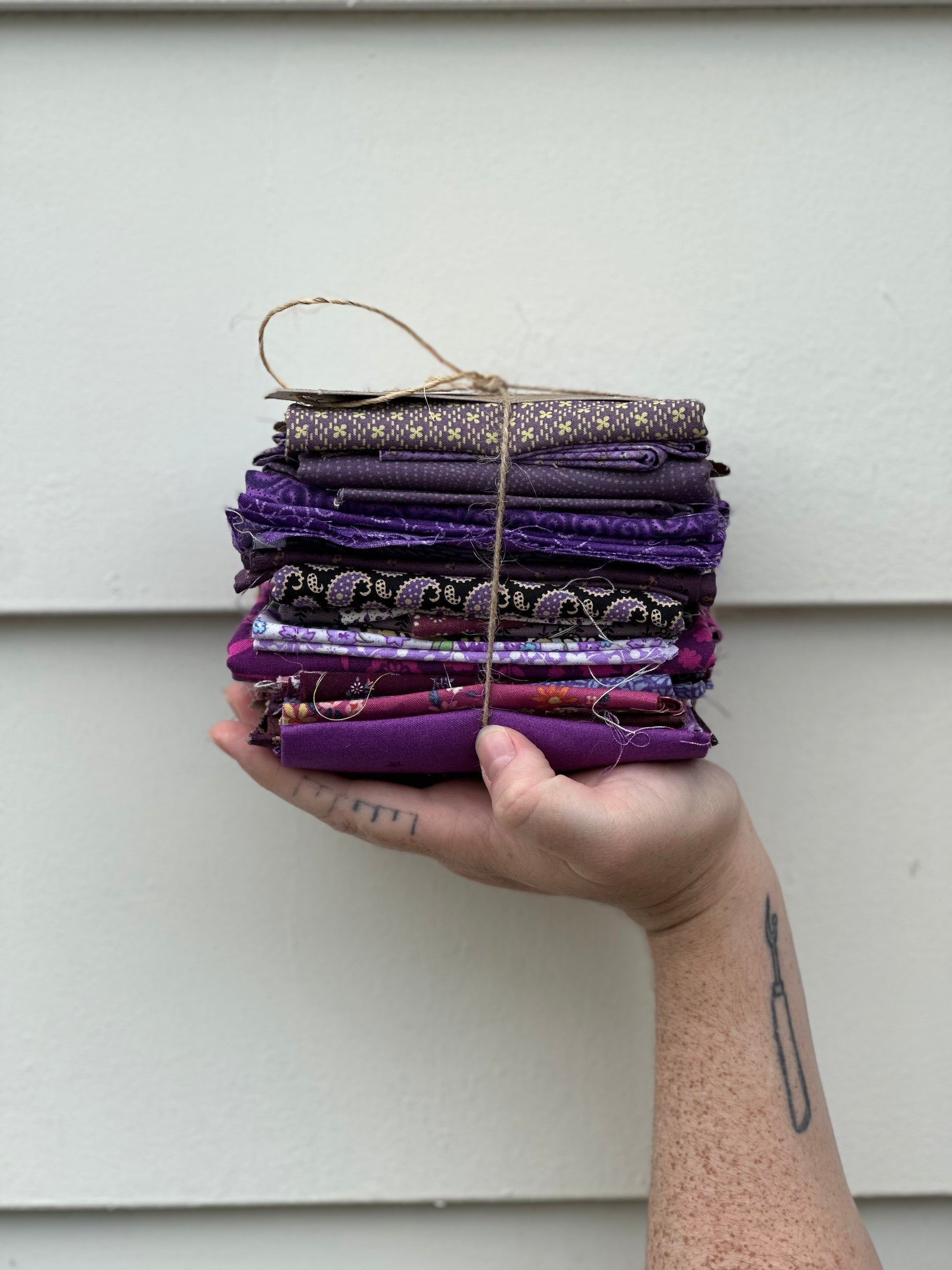 A cozy little bundle of fat quarters and smaller in all different tones and tints of PURPLE. Scrap-sized treasures - perfect for sparking your next thrifty, one-of-a-kind creation.ย