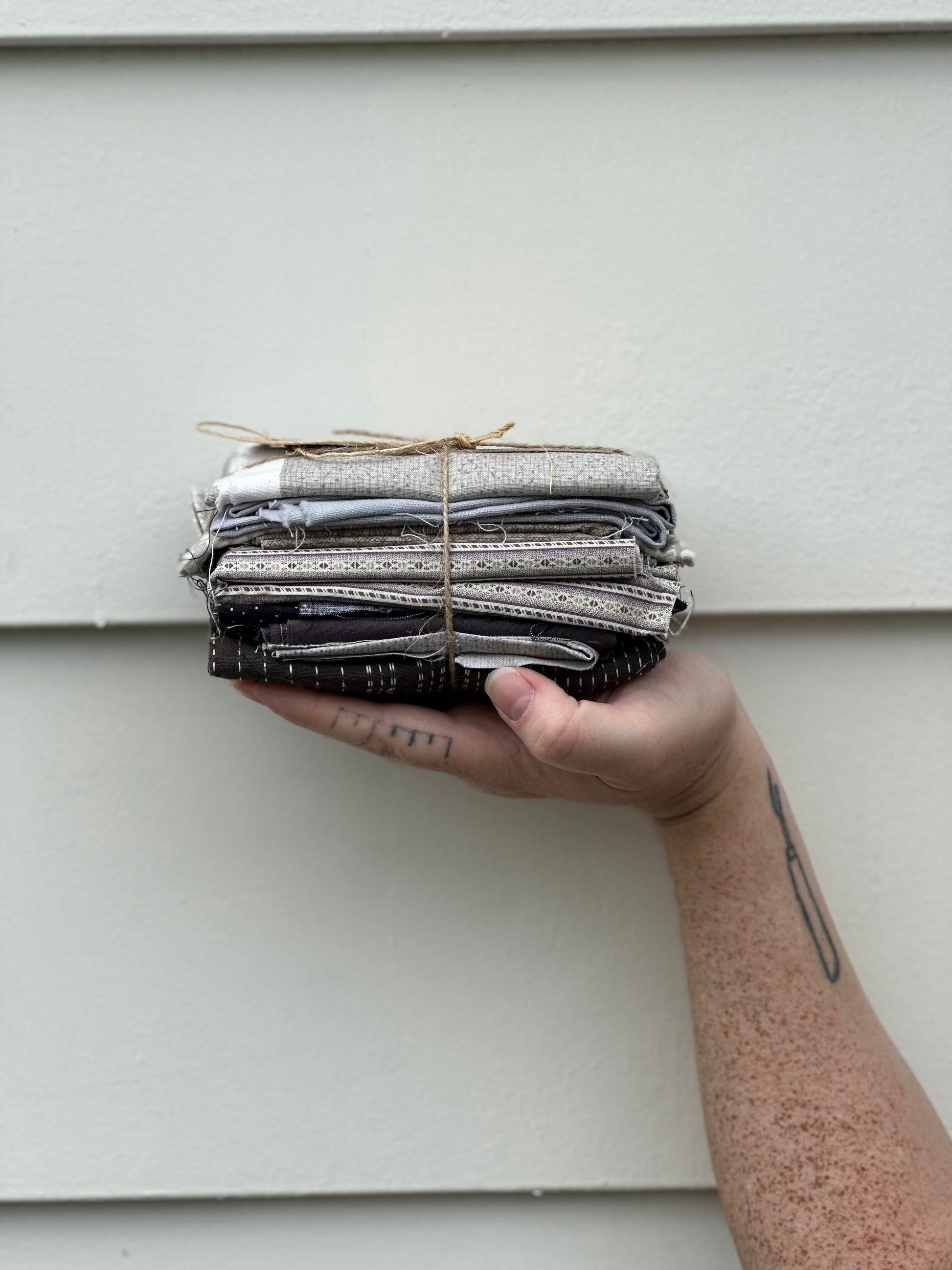 A cozy little bundle of fat quarters and smaller in all different tones and tints of GREY. Scrap-sized treasures - perfect for sparking your next thrifty, one-of-a-kind creation.ย