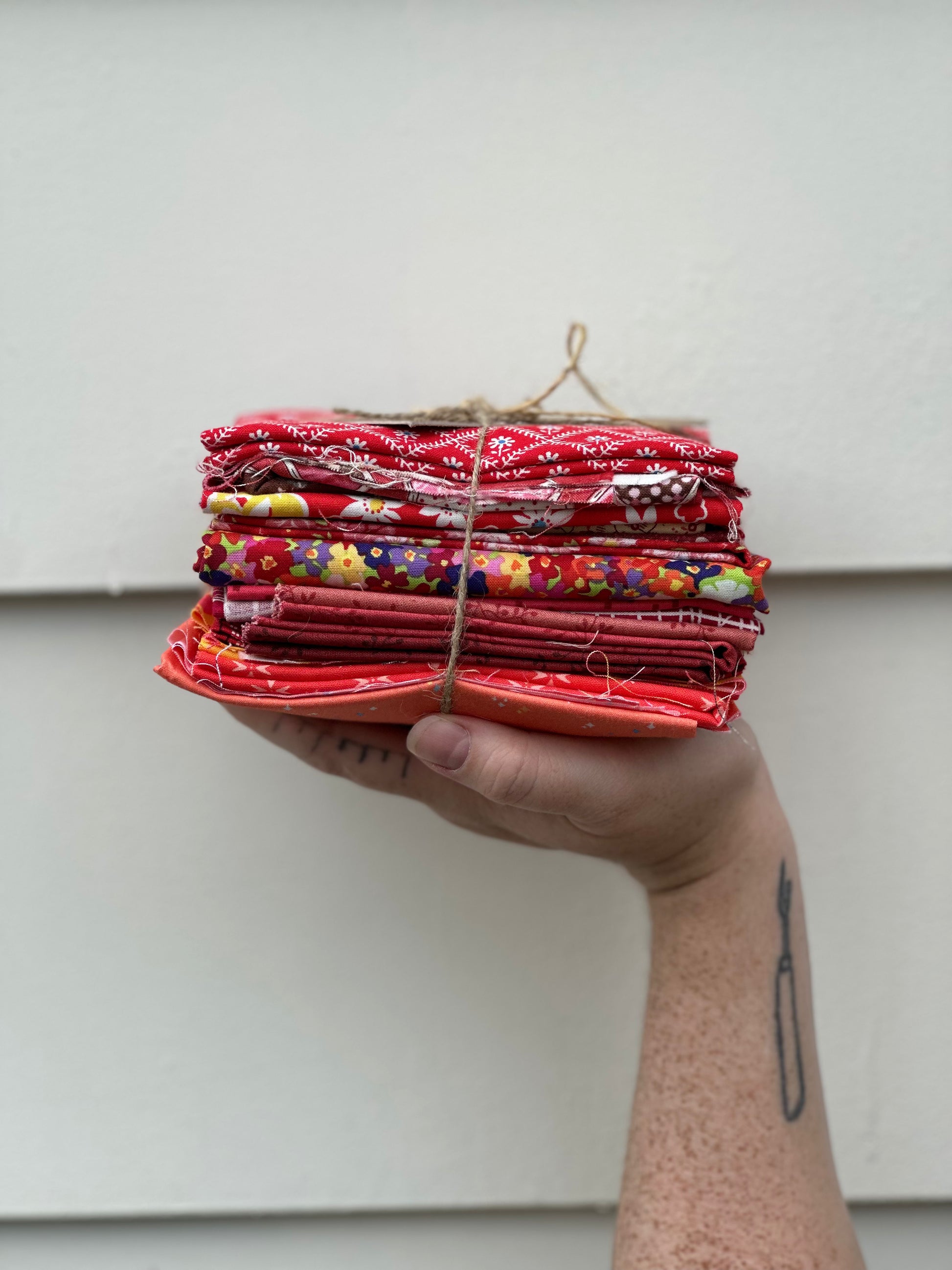 A cozy little bundle of fat quarters and smaller in all different tones and tints of RED. Scrap-sized treasures - perfect for sparking your next thrifty, one-of-a-kind creation.ย